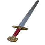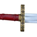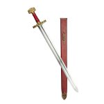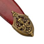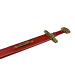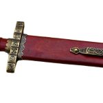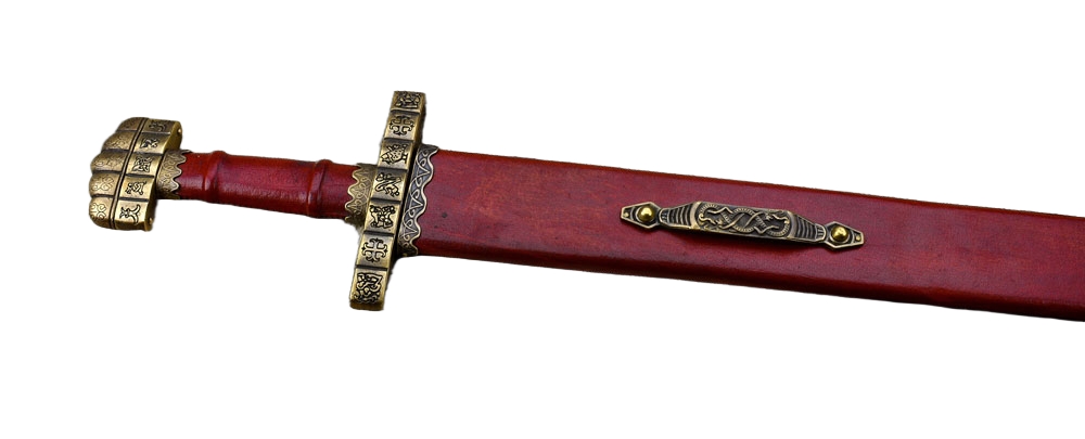 This replica of the 9th Century Danish Viking Hedeby (Haithabu) sword has a blade of high carbon steel which has been tempered. It is mounted into a highly detailed hilt of antiqued brass which is completed with a leather-wrapped grip of hardwood. The sword is paired with a wooden scabbard which is wrapped in tight leather and completed with antiqued brass fittings, including a brass hanging loop which allow for the sword to be worn on your own belt or baldric.
