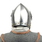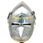 The Medieval Hounskull Pigface Bascinet is designed after the original 15th century open faced military head gear. This style emerged from an iron or steel skull cap and extended down the sides and back to offer maximum protection for the neck. This reproduction features 18 gauge steel craftsmanship with brass adornments. It comes with a removable visor that includes 28 breathing holes for ventilation and wide eye holes for excellent visibility. To ensure a comfortable fit, an adjustable leather liner is also included. Fully functional with true medieval flair, this helmet is great for costumes, collections, and re-enactments.