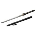 The dismountable double-pegged Tsuka of the Iga Ninja-To features a traditional wrap over natural rayskin and Clouds and Sun/Water and Moon Menuki. The blackened iron fittings include a Tsuba displaying the Iga Mon and a wave motif, both repeated on the Fuchi/Kashira. The Saya features a partial rattan wrap and a heavily reinforced spike. The Iga features a forged high carbon blade, differentially quenched to an edge hardness of 60HRc. Essential tool for the Ninjutsu practitioner.