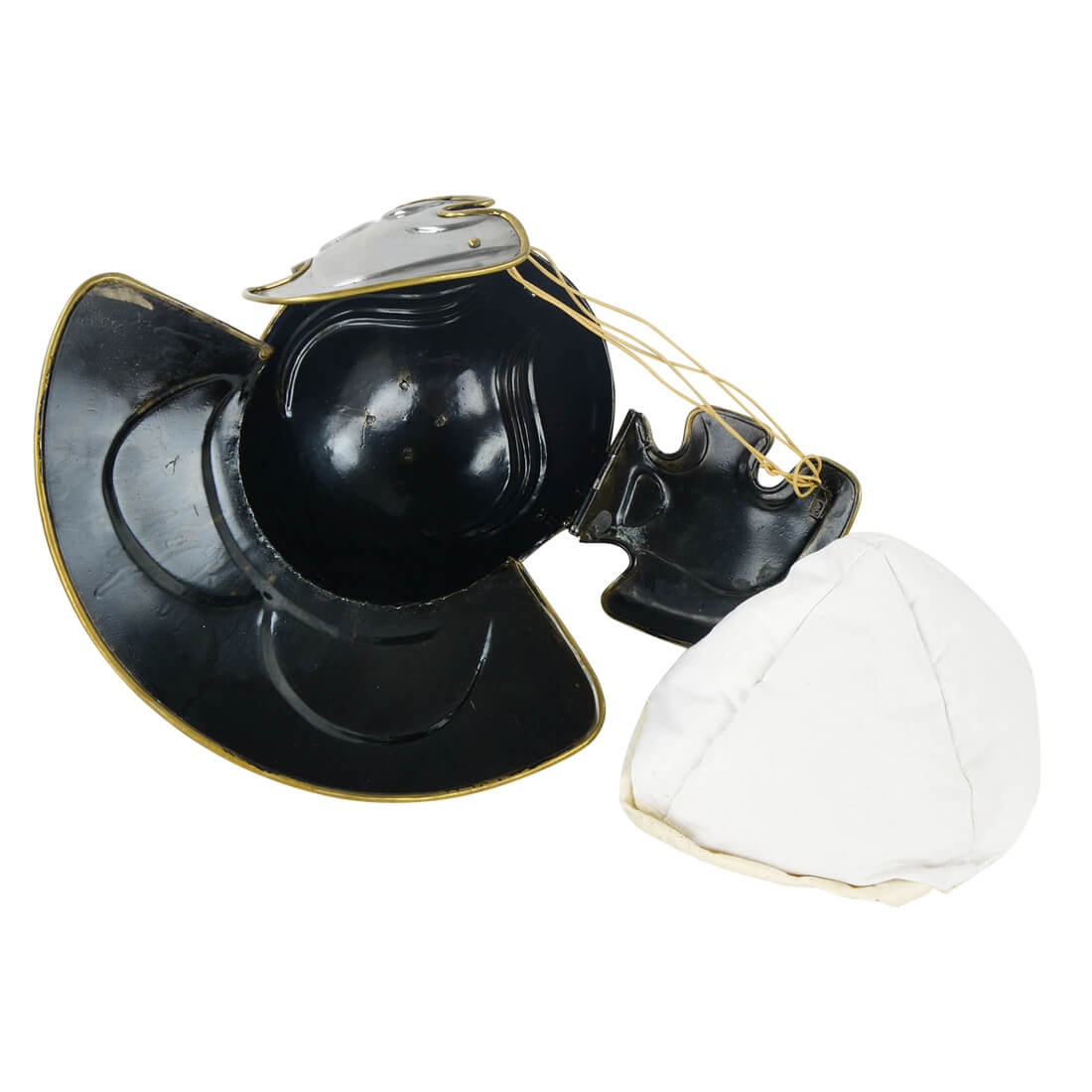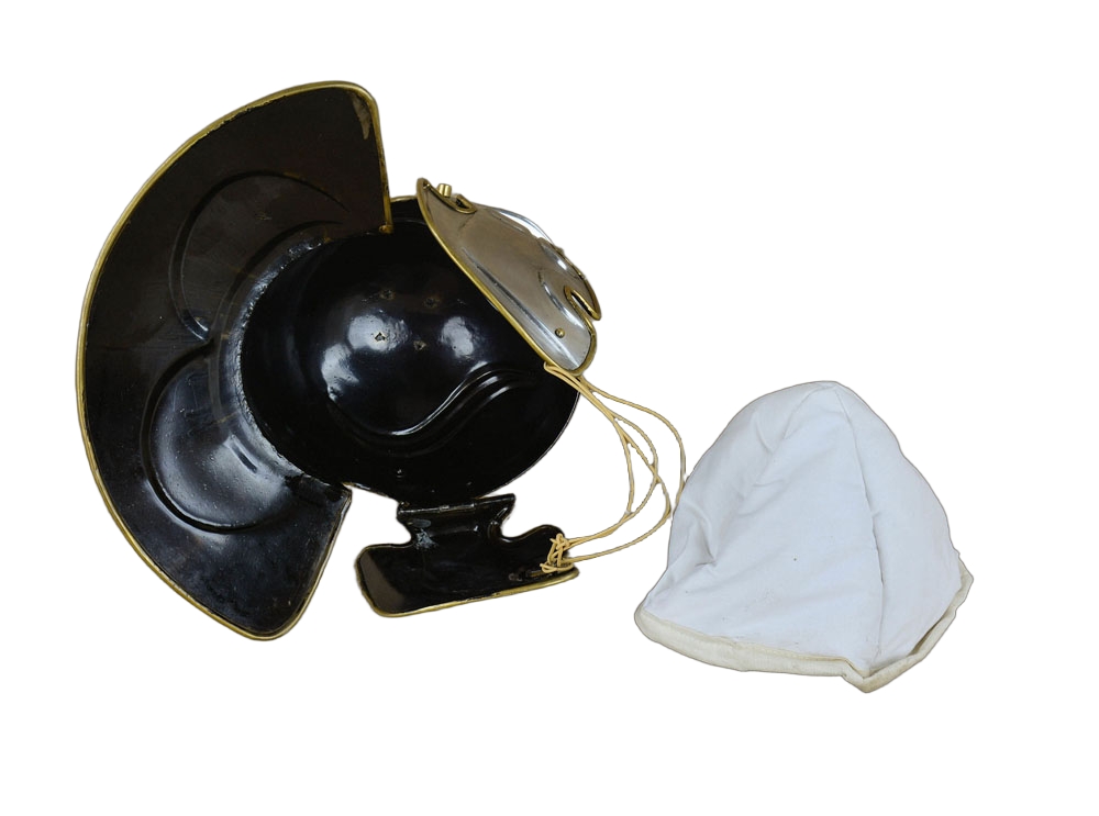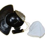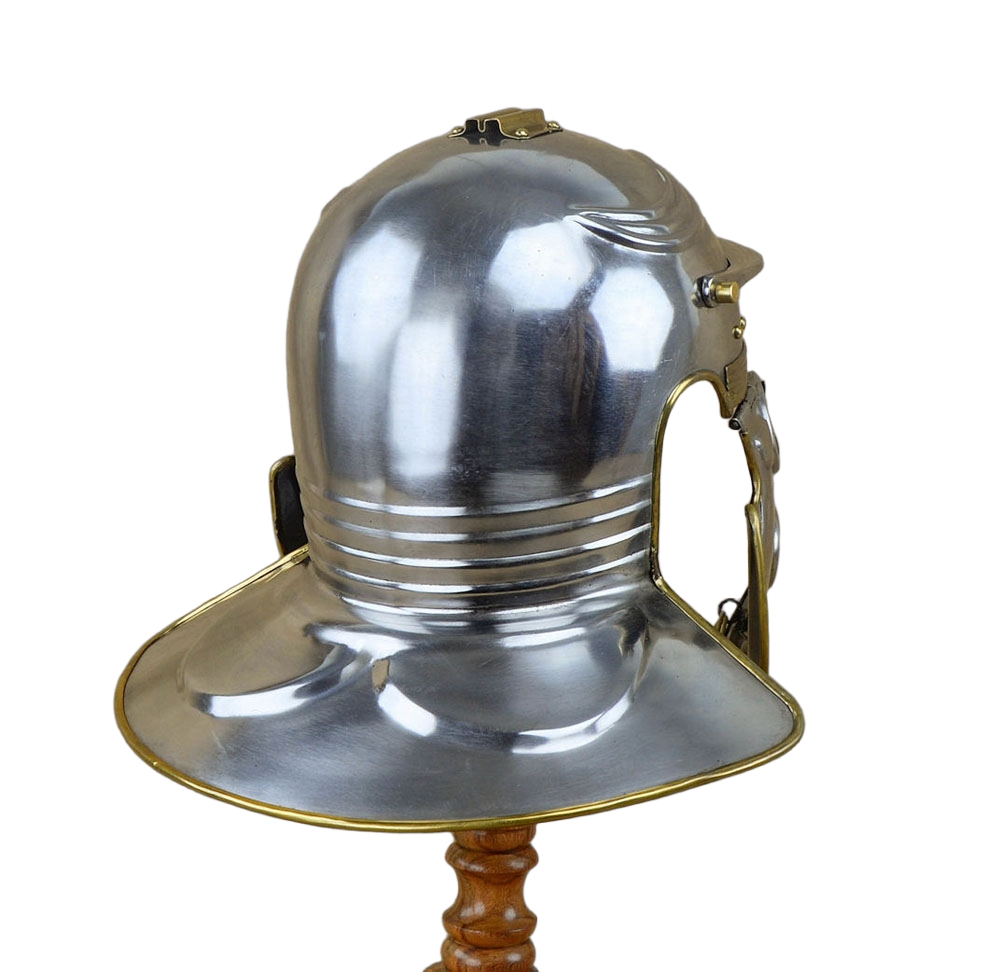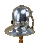 The Imperial Roman Gallic ??C?? Helm is constructed from 20 gauge steel with brass accents. The cheek plates are hinged and fitted with small brass rings to tie the included leather cord chinstrap onto. A brass crest holder is riveted atop the helmet. The interior of the helmet is unlined and blackend – included with the helmet is a cotton padded arming cap.
