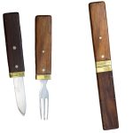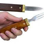 Whether camping or in the kitchen, the Interlocking Knife and Fork Set are bsure to please. Featuring solid steel construction, these utensils come with brass holsters and wood grips. For convenient storage and portability, this set is accompanied by a block which they interlock into. Simple and practical, this set promises to be a wonderful addition to your dinnerware collection.