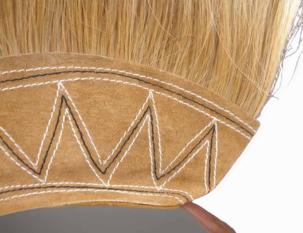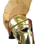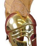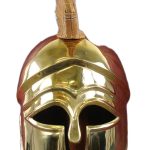 Corinthian helmets originally came out of Greece and was carried to Greek colonies in Sicily, Italy and Spain. Traces of these helmets have also been found in Celtic graves. This helmet represents a fully refined example from around 400 BC, and is the only helmet in the market made exactly to specifications as was found. Throughout the 5th and 4th century BC, the Greek Helmet continued to evolve, still with a view to improving ventilation, hearing and vision, without sacrificing protection. The "Chalcidian" helmet continued to be very popular, but improved versions with a cranial ridge for better protection started appeared. Some pieces also had ear hinges for cheek pieces. The nasal piece also became smaller and disappeared from some of these helmets, giving rise to the "Attic" style of helmets. Our replica is superb, made out of solid brass and includes an authentic plume. This helmet is fully wearable or can be put on display.