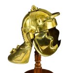 The Italic H Roman Helmet, known to many as the Niederm?rmter type, was produced in both brass and in iron fitted with brass furniture. Our replica is superb, made by Deepeeka, and is an exact replica of the actual helmet used by Roman legions. The brass helmet, based on the famous example now in the Landesmuseum Bonn, which Robinson regarded as the best Roman helmet to have survived from antiquity. It incorporates many features that are seen on other helmets, both Italic and Gallic in family origin, and may be considered the pinnacle of those helmet families with design features seen from both types of helmets. This helmet design is the last major helmet in the imperial Gallic Italic legionary helmets and dates to around 200AD. After this infantry helmets were not seen again for another 200 years and those bore no resemblance to the classic Roman helms.