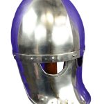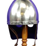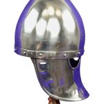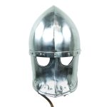 This Sicilio-Norman Helm is constructed from 16 gauge steel. The interior is blackened and fitted with an adjustable leather suspension liner. A chinstrap with a brass buckle complete the helm for use.