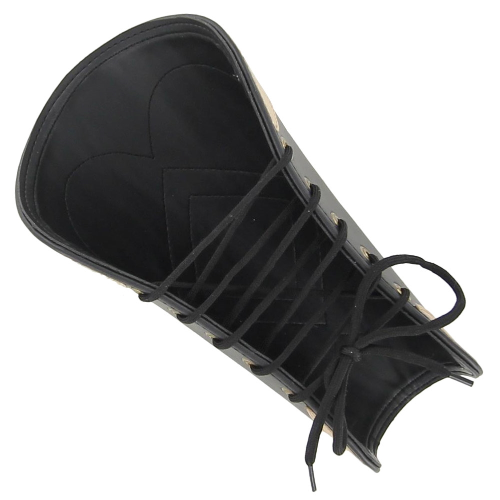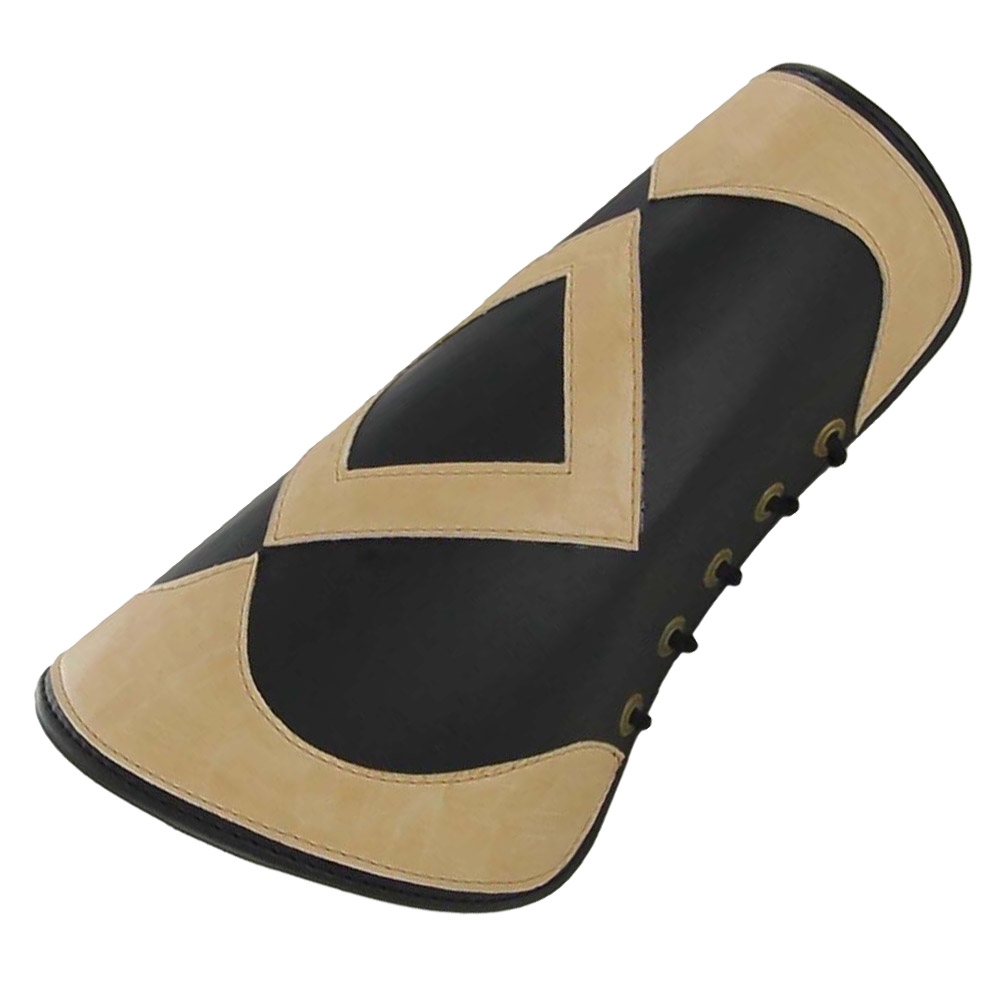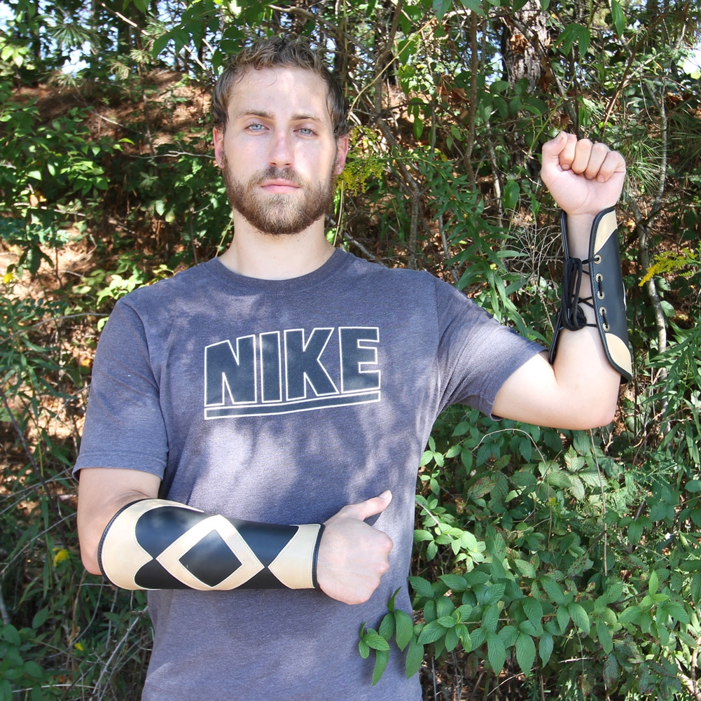 These decorative pieces are great for completing a fantasy costume or adding a little something different to traditional armor or clothing. Made From thick black leather with beautiful tan leather designs these bracers will surely get you noticed. Brass rivets line the sides with a nylon lace so you can adjust to the perfect size for you. Made to protect ones forearm from blows, the Kings Ransom Handmade Leather Bracer Set is a must have.