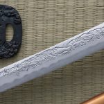 The new Kinryu Katana is the first in a series of limited edition forged and folded katana featuring an intricate dragon motif horimono on the blade. The 27 ¾ blade is folded using T10 and 9260 steels to produce a pronounced hada which is more visible in the hamon. The blade is well balanced and appropriate for various cutting demands. The tsuka is 11 ¼ long is wrapped in brown silk over real black dyed same. The deep gold saya features a black-lacquered rattan wrap at the mouth. The koiguchi, kurikata and kojiri are real buffalo horn. The hardest decision you have to make after you wrap your hands around will be whether you want to cut with it or just admire the skills and effort that it took to create it.