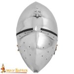 The Klapvisor Bascinet is constructed from 16 gauge steel; the visor is hinged and can be raised, it can also be secured in the down position with the buckled visor strap. The interior of the helm is blackened and fitted with an adjustable suspension liner of padded cotton. The brass fixtures along the bottom of the helm can be used to anchor an aventail of chainmail.