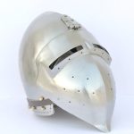 Maximize protection for your head with the stylish Klappvisor Bascinet. Keeping with the traditional design that is characterized by a visor that is hinged at a single point in the center of the brow of the skull, this piece features 14 gauge steel construction with a blackened interior and cotton suspension liner. It is highlighted by a visor which raises and secured in the down position with a buckled strap. It also allows for attachment of a chainmail aventail with brass fixtures. Great for costumes and re-enactments.