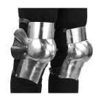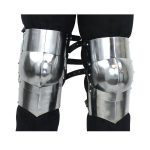 This set of well-articulated knee armor consists of a knee protecting poleyn, side fan plates and several more plates to protect the area both above and below the knees. They are constructed from 16 gauge steel with strong swivel rivets and each is affixed to the leg and adjusted to fit with thick leather straps and sturdy steel buckles on the back. The interior of the armor is blackened.