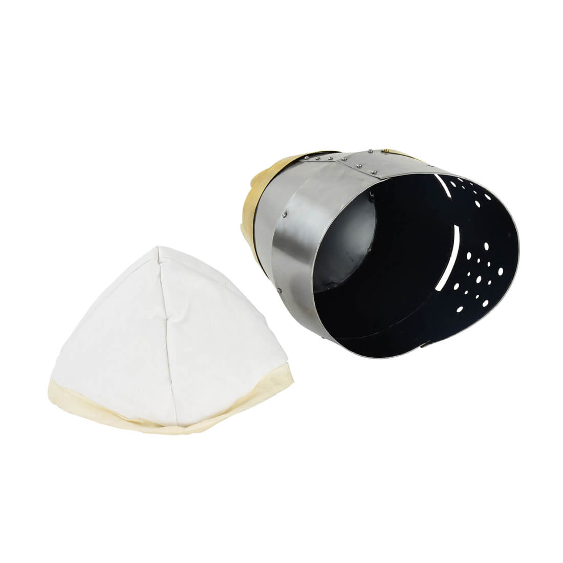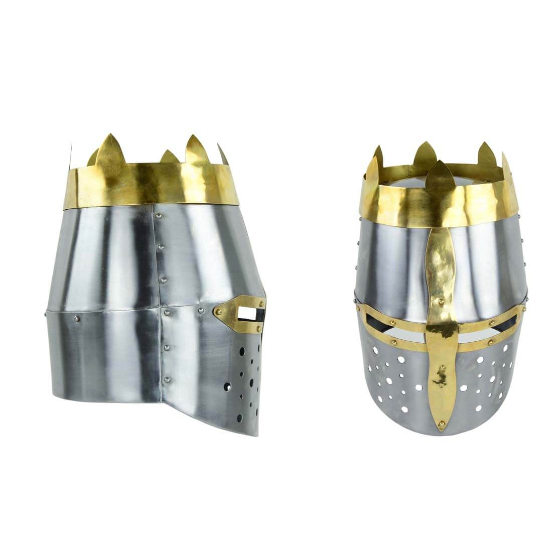 Coming directly from the High Middle Ages, the Knight Crown Helmet, considered one of the Great Helms, would have most likely been worn by knights and Christian armies during the Crusades. Made by Deepeeka, this piece authentically reflects the medieval era and is based on a great deal of historical research. This Kings Great Helm is made from riveted 20 gauge steel and embellished with an integrated brass crown and brass detailing. The unlined interior is blackened. Included is a cotton padded arming cap.