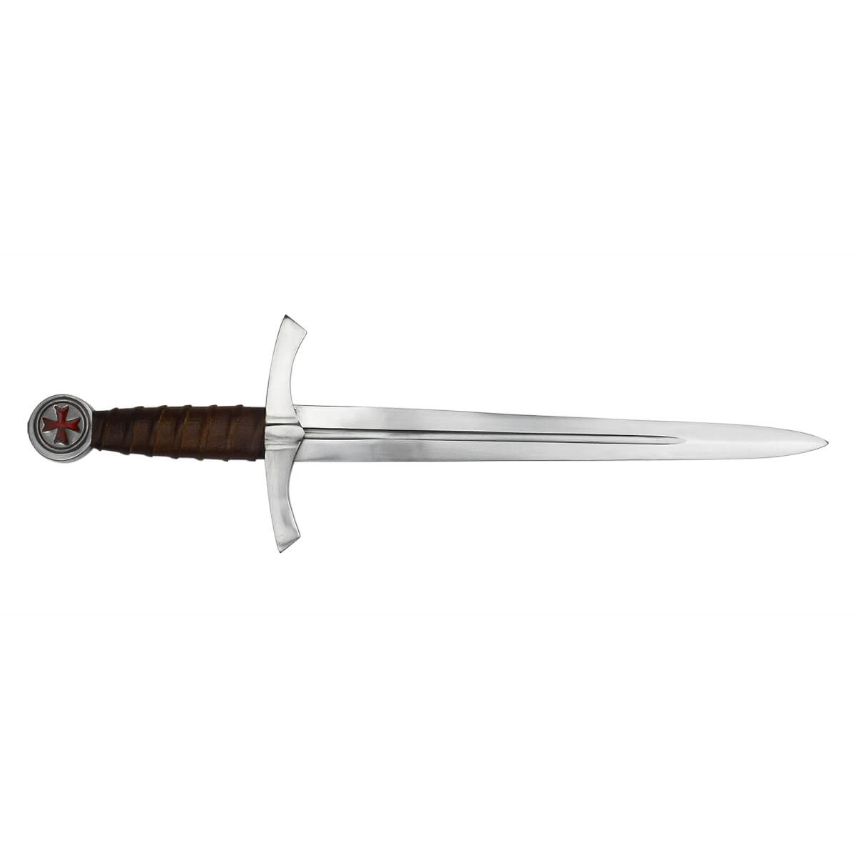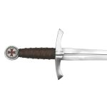 This Knight’s Templar Dagger is crafted from high carbon steel. The guard and pommel are steel and the grip is hardwood which is wrapped in tight leather. The dagger is sturdily constructed by anchoring the blade into the hilt with a peen on the pommel. Both sides of the pommel feature the Templar Cross which is filled with inlaid red enamel for a striking appearance. Included is a sheath of stitched leather.