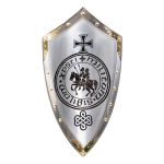 This all steel shield from Marto of Spain depicts the seal of the Templars, a horse ridden by two riders, along with their famous black cross. The edges have been accented with polished brass and heavy rivets. Comes with hanging chain attached. Made by Marto of Spain
