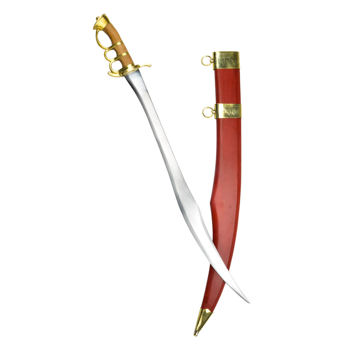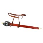 This brutal Cutlass is designed for the heaviest of close-combat; the forward-sloping blade brings great chopping power and hacking prowess to the fight, whilst an integrated knuckle-duster guard ensures that even the hilt of this cutlass is a deadly weapon at close range. The blade is high carbon steel and the hilt is brass with polished wood for the grip. Wielders with large hands may find that the hilt feels too small or uncomfortable. Included with the sword is a wooden scabbard which is bound with leather and finished with brass hanging rings and brass accents.