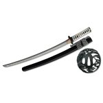 The Koi Wakizashi from Paul Chen has a hand-forged T10 high-carbon steel blade. The blade on this is differentially hardened using the traditional claying method. The Koi Wakizashi is mounted in black and white and features black same, the tsuka-ito is made of premium white Japanese cotton. The saya is finished in a deep black lacquer with a black and white striped cotton sageo. A finely rendered Koi, with true front-and-back detail, forms the black iron tsuba. The fittings are superbly antiqued adding to the aesthetics of the piece. The Koi Wakizashi from Hanwei is supplied with a protective cloth bag and traditional maintenance kit.