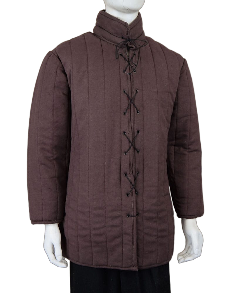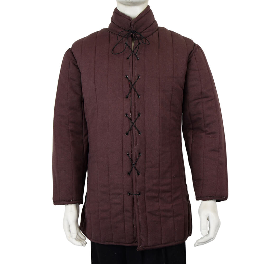 Maximize your comfort and protection with the Laced Front Gambeson (Brown). With an authentic look, this garment is crafted from durable, quilted cotton with organic cotton felt padding on the interior. Further enhancement comes from elegant front lacing which secures the piece. This gambeson is both pleasant to the touch and stylish and is great for costumes and re-enactments.