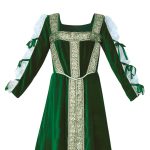 Drawing inspiration from the Tudor period and more specifically, from King Henry VIII’s only wife that bore him a son, comes this lovely Lady Jane Dress. Made from beautiful green cotton velvet, this attractive garment is highlighted by soft, sheer netting and green bows on the sleeves. Hugging the curves and flowing freely, this dress is complimented with hand beaded gold trim and is comfortable and luxurious, making it an impressive addition to any wardrobe.