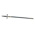 This Freemason Ceremonial Sword has a blade of high carbon steel with etched design on both sides of the blade. The hilt is crafted from antiqued brass and the scabbard is leather over a steel core. The scabbard is finished with fittings of antiqued brass.