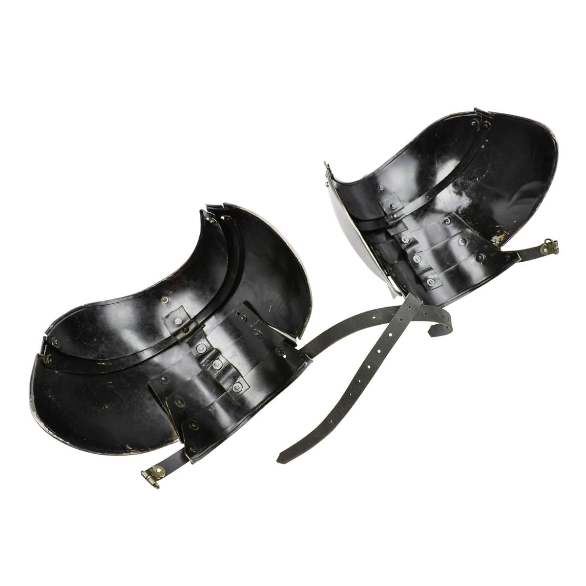 The armor is donned by buckling and securing it to gorget or breastplate with an extra leather strap to connect to the pauldron buckle. A second set of buckles and thick leather straps are used to secure the armor to the upper arm.