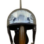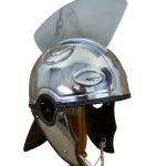 This Late Roman Centurion Helmet is made from 18 gauge steel with leather lined interior for comfort. This helm is an excellent reproduction by Deepeeka. It features a central metal crest and is similar to the light infantry helmet, probably worn by auxiliaries instead of the legions. It seems to have been based on the similar two halves “ridge” helmets of Rome’s enemy, the Sassanian Perisan empire.