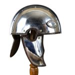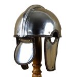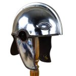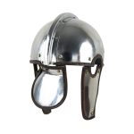 This Late Roman Intercisa Helm is constructed from 18 gauge steel; the cheekplates and neck guard are hinged and integrated onto the helmet with riveted leather hinges.