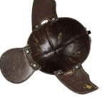 The entirety of the inside of the helmet is lined with leather, as are the inside surfaces of the cheekplates and neck guard. Two small brass rings are fitted to cheekplates and these can be used to tie a chin strap in place (cord not included).