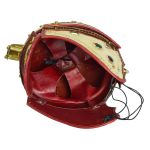 This Late Roman Berkasovo Helmet is constructed from 18 gauge brass and it is heavily studded with inset faux gemstones of glass. The entire interior of the helmet is lined in stitched leather and fitted with an adjustable leather suspension liner. Two rings on the cheekplates serve as anchor points for the leather cord chin strap (included).