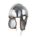 This Late Roman Intercisa Helm is constructed from 18 gauge steel; the cheekplates and neck guard are hinged and integrated onto the helmet with riveted leather hinges.