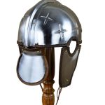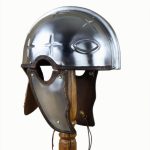 Our Late Roman ‘Ridge’ Helmet is made from 18 gauge steel with leather lined interior for comfort. This is a typical light infantry helmet, probably worn by auxiliaries instead of the legions. The ridge helmet seems to have been based on the similar “ridge” helmets of Rome’s enemy, the Sassanian Perisan empire. The eyes placed on the front of the helmet are reminiscent of the eyebrows on the fronts of the Imperial Gallic Helmets, and appear to be a Roman feature, not seen on Persian helmets.