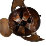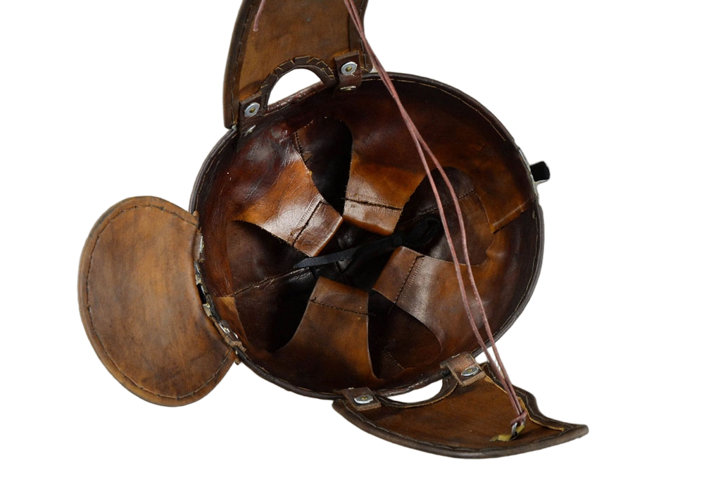 The entirety of the inside of the helmet is lined with leather, as are the inside surfaces of the cheekplates and neck guard. Two small brass rings are fitted to cheekplates and these can be used to tie a chin strap in place (cord not included).