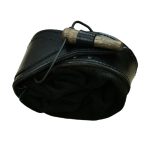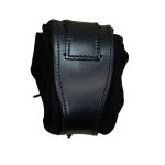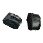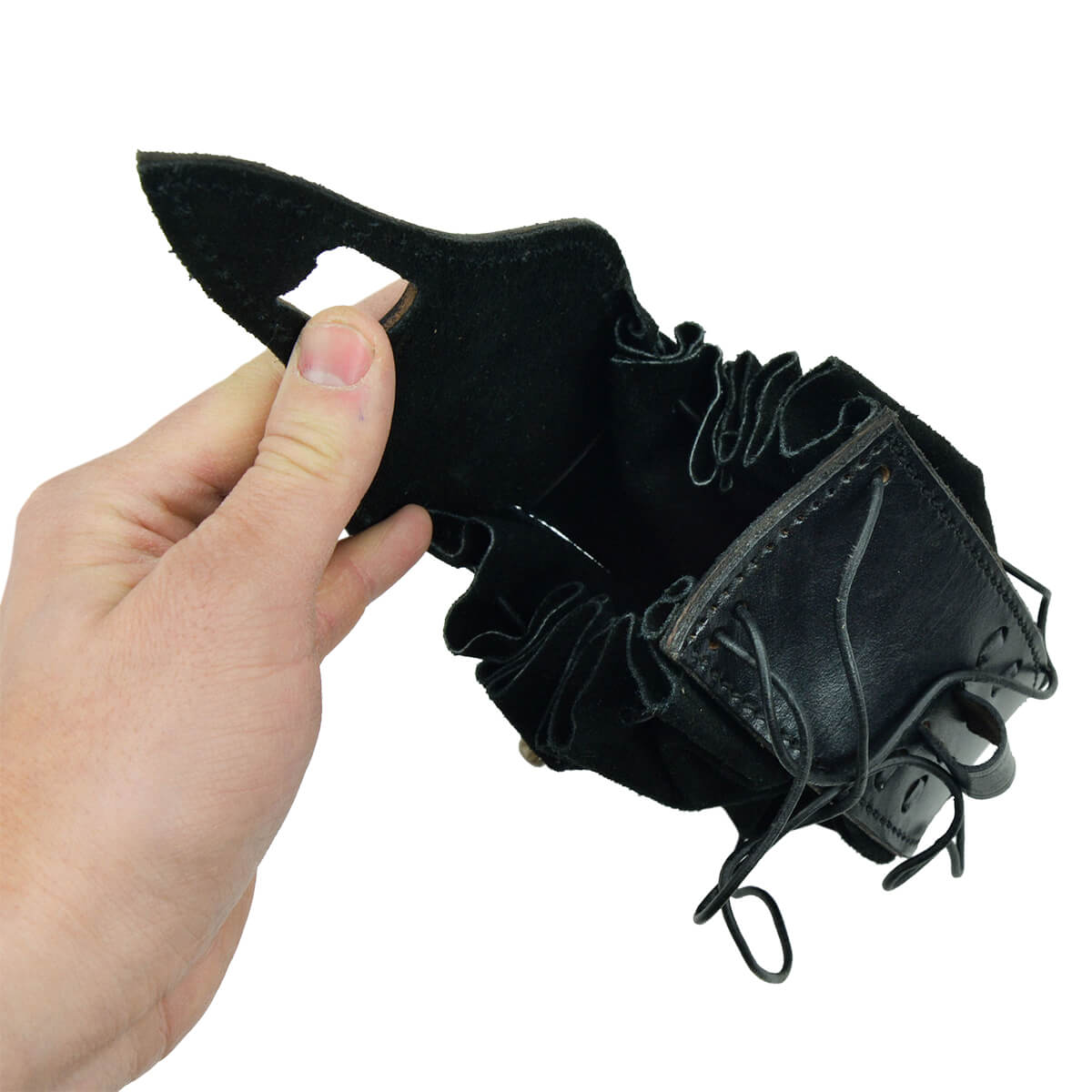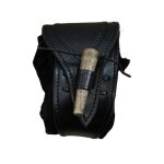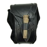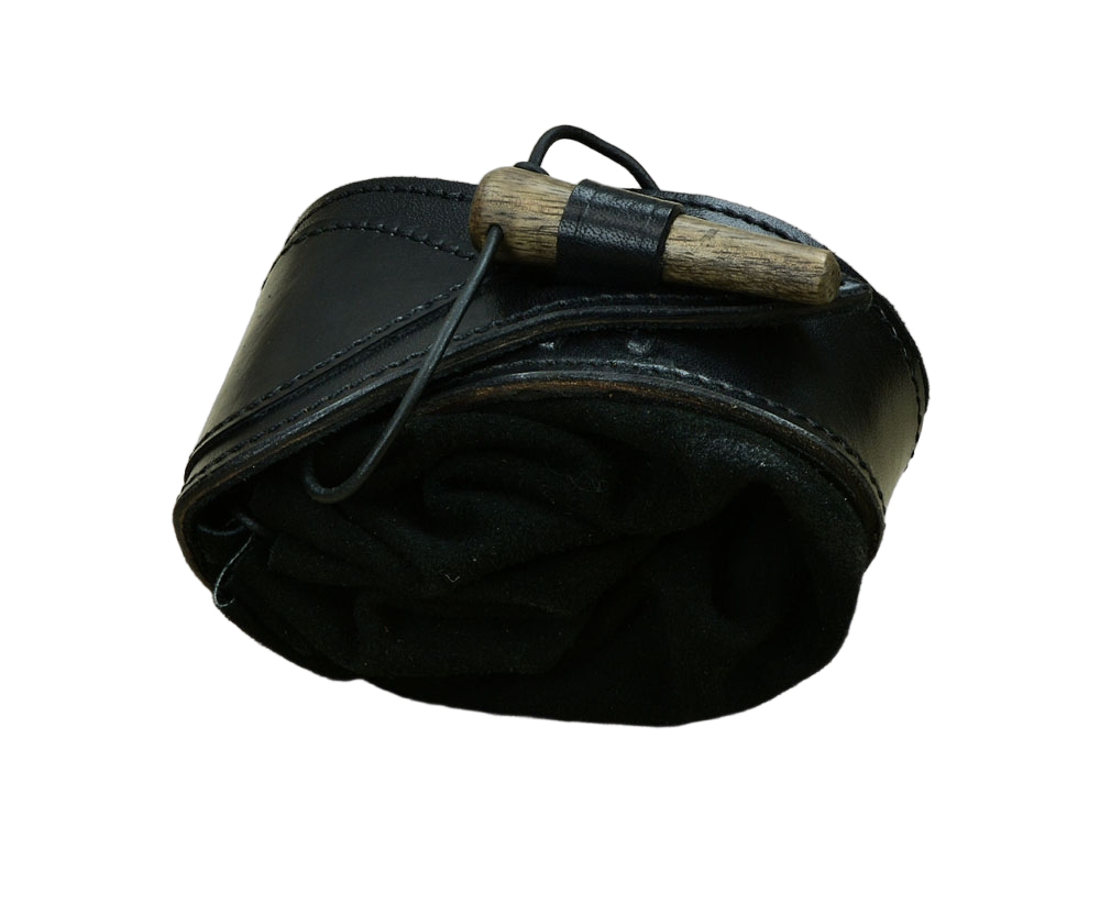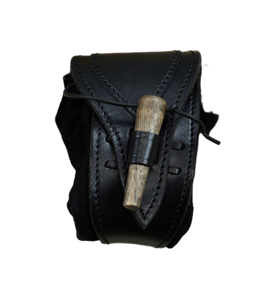 This belt pouch is crafted with a shell of hard leather and an inner pouch of suede leather. A belt loop is on its back and the pouch is secured closed with a wooden toggle. An integrated leather drawstring can be used to draw the bag tight.