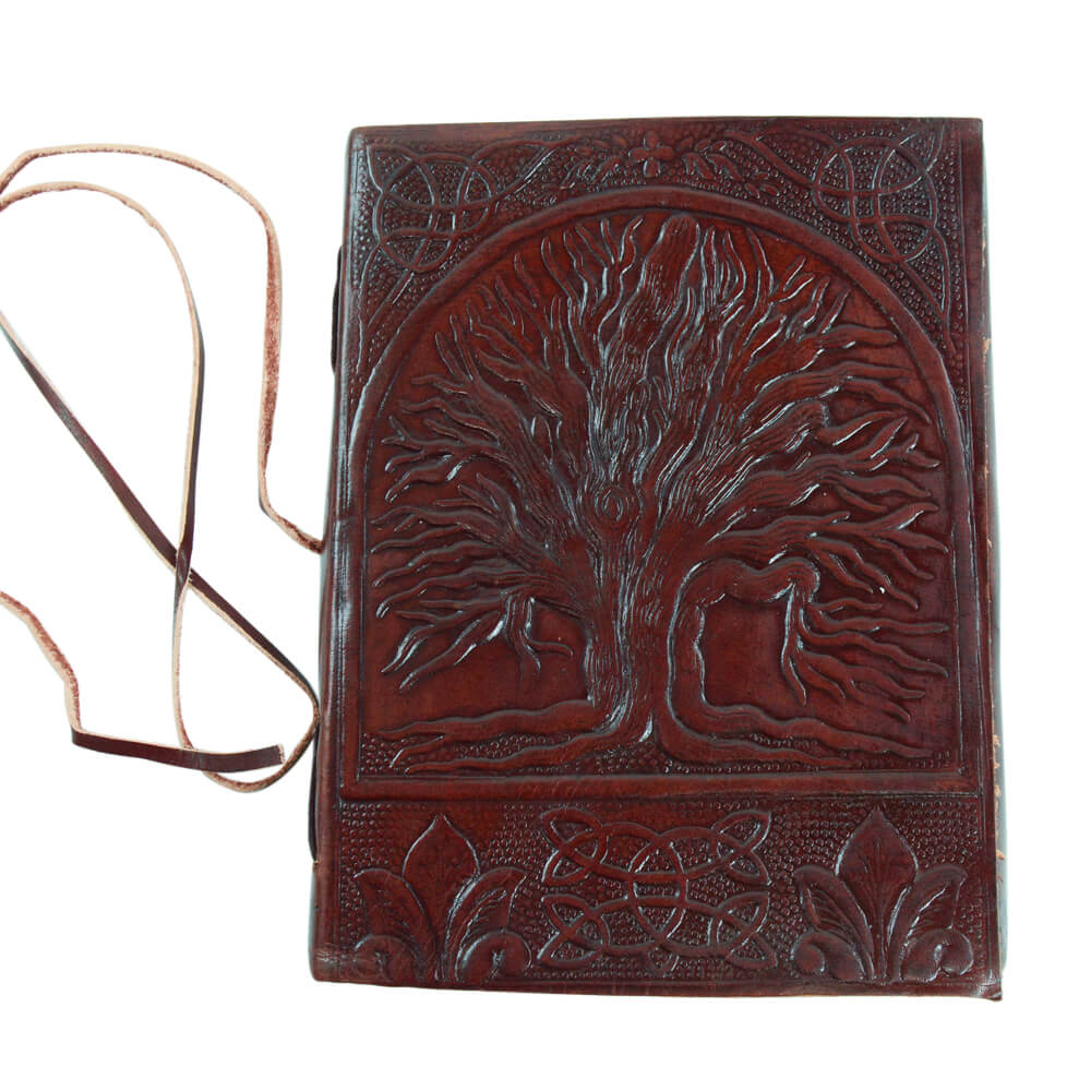 If you are looking for a special place to record your musings and personal thoughts, then the Leather-Bound Tree of Life Journal with Gemstone is sure to please. You’ll love writing in this beautiful handmade book featuring a genuine leather cover which holds approximately 220 pages (counted front and back) which are stitched to the binding. The real highlight of this piece, however, is the ornate Celtic design on the front cover that truly shines. In addition, a leather cord is included to tie and secure the piece. Whether you are giving this journal as a gift or using it for your own ponderings, this promises to be a precious keepsake. 7″ x 5 1/4″ x 1″ – Appx. 220 pages