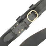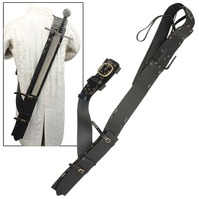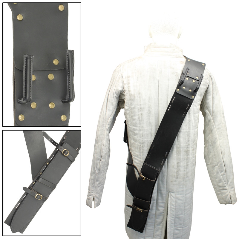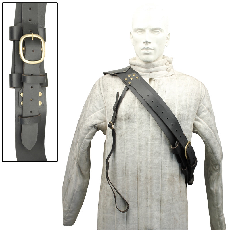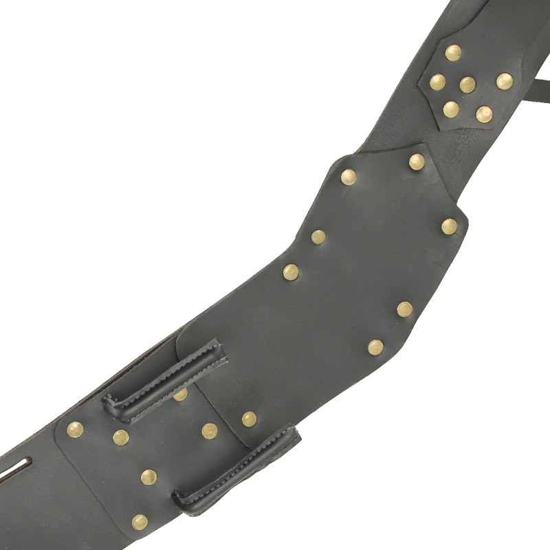If you are in need of a piece to hold your sword at your next event, give the Medieval Genuine Leather Long Sword Baldric Hanger a try. It allows the weight of the sword to rest at the waist while the shoulder provides an extra degree of support. Genuine black leather craftsmanship is used for the baldric and scabbard area. Both are accented with brass rivets and the baldric also features brass buckles. The scabbard area can be adjusted to accommodate your sword length with the inclusion of buckles and the shoulder strap also allows for a custom fit. In addition, a separate section of leather thong hanging from the shoulder strap enables easy attachment to your belt. With authentic design, this baldric is perfect for your long swords and claymores and great for re-enactments.