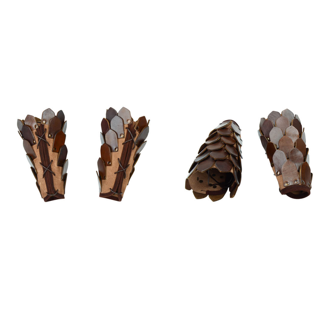 These bracers are constructed from thick leather scales which are brass riveted to a suede leather backing. It is fitted to the arm with leather laces, which are included.