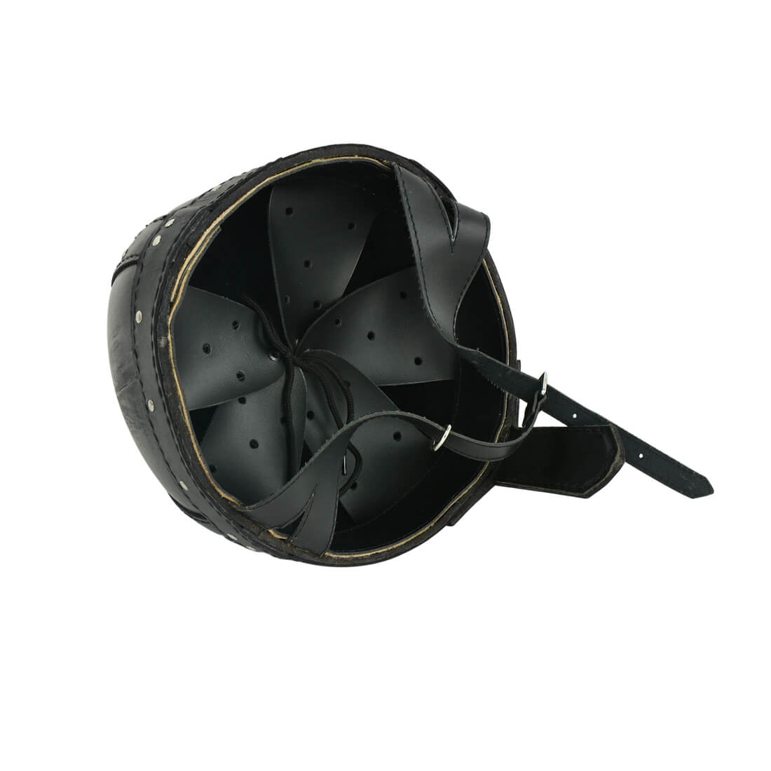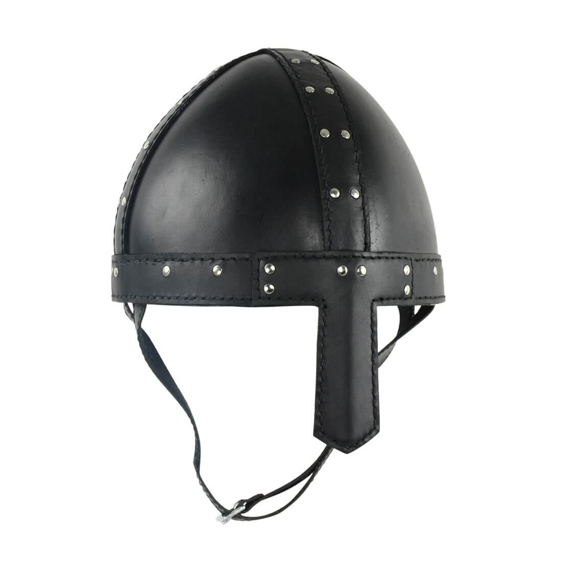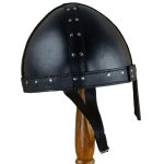 This Spangenhelm is constructed from thick leather with steel riveted and stitched construction. The interior of the helm has an adjustable faux leather suspension liner and it is finished with a faux leather chin strap with a steel buckle.