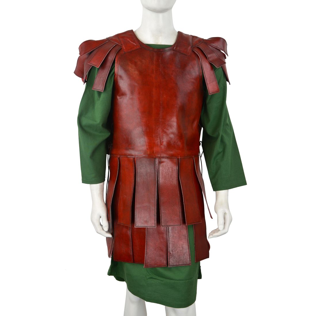 This Roman Subarmalis is crafted from chrome tanned split leather which is approximately 4-5 oz in leather thickness. The inside is lined with softer suede leather; it is fitted around the torso with leather-laced sides.
