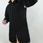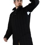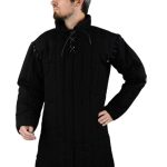 This gambeson is constructed from canvas with a poly fill interior and features laced-on sleeves which can be removed to modify this armored garment into a vest. The collar lacing is thick leather cord, as is the lacing used for the sleeves. This gambeson is not as thickly padded as many others and thus it is not as stiff as many others on the market it has a flexibility comparable to a thick coat.