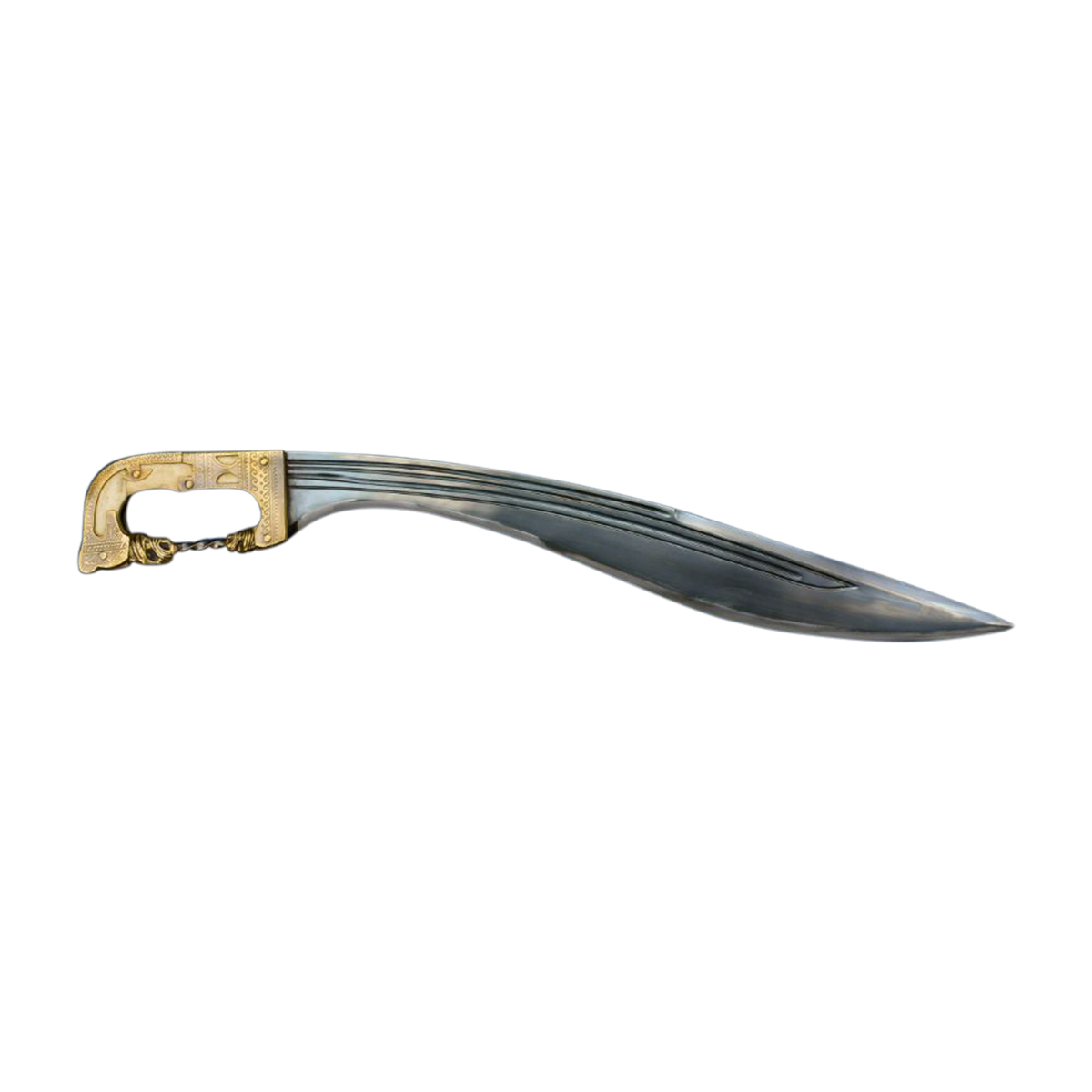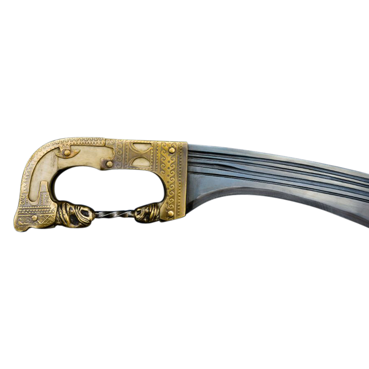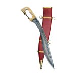 This Falcata from Deepeeka is closely based on a historic Iberian original that is kept within the collection of the National Archeological Museum of Madrid in Spain. This reproduction of a particularly elaborate and embellished Falcata has a blued blade of tempered C60 high carbon steel (a steel with properties very similar to 1060 high carbon steel) its forward swept recurve blade was purpose designed for powerful, helmet splitting chops and fearsome hacks and cuts. The blade is mounted into the hilt with a full tang construction that has two grip scales of polished bone which are riveted directly to the thick blade tang. The hilt is finished with highly detailed plates and a knuckle bar of antiqued brass.