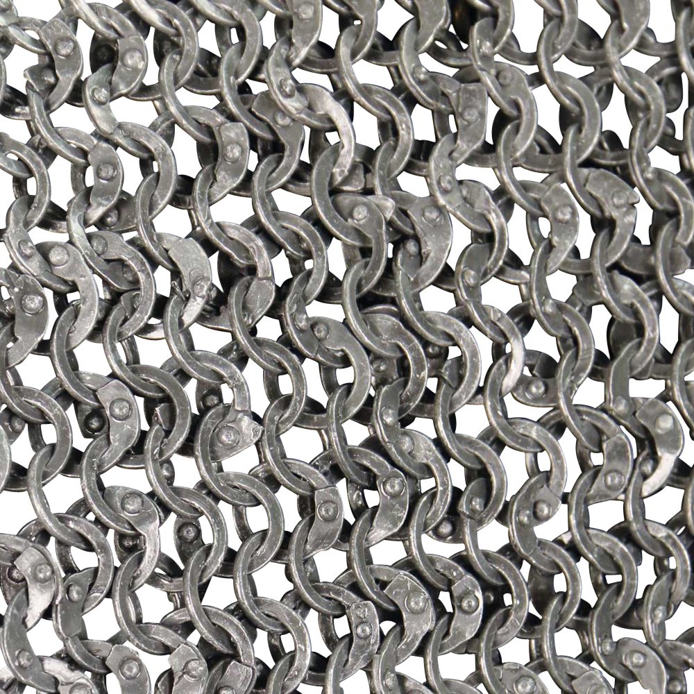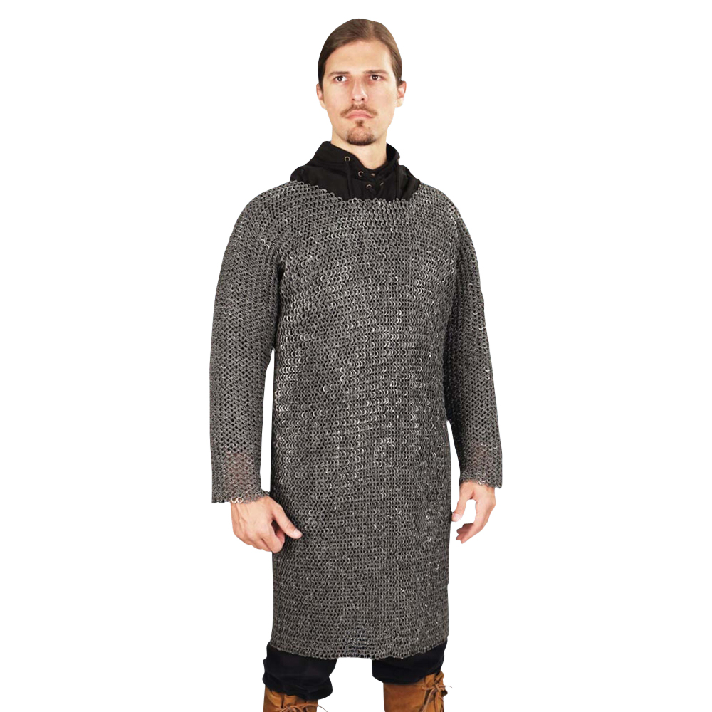 This Darkened Aluminum Mail shirt is one of the most unique we have ever offered. We designed these for a major motion picture and are now offering them to the public. Each aluminum link is flattened, riveted shut and then chemically darkened. In addition, it is the first suit to have full-length sleeves. The diameter of each outer link is about 3/16. Mail shirts fit up to a 46″ chest with a 38 long shirt and Fits up to a 26 Inch Sleeve Length. Made by Windlass Steelcrafts. Matching coif available. Wt: 13.5 lbs