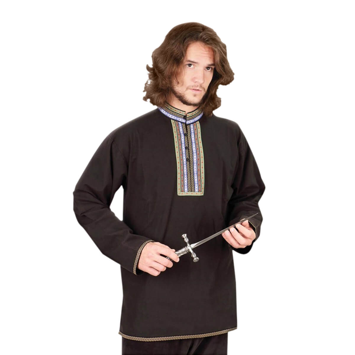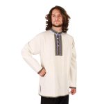 The design of these 100% Marco Polo cotton mens shirts has been in use for hundreds of years and in many different countries. This lightweight shirt has a four-button opening at the neck and a 1-1/2″ embroidered folk-style trim sewn around the collar and placket. A smaller matching trim decorates the cuffs and hem. Perfect for events and even everyday wear.