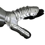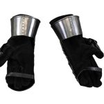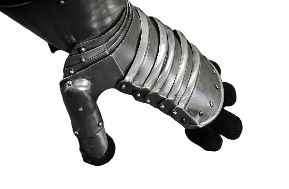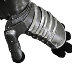 Whether engaging in close combat or distance fighting, these Maximilian Gauntlets promise excellent hand protection. Seeing as how one blow to the hand can be fatal, why take the risk? This pair features riveted 16 gauge steel plates with a blackened interior and affixed to suede leather gloves. Each piece attaches to the inner thumb, but it also allows for flexible movement within. Authentic in design, these gauntlets are great for costumes and re-enactments. Overall Length: 15”