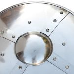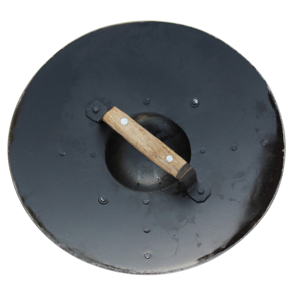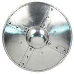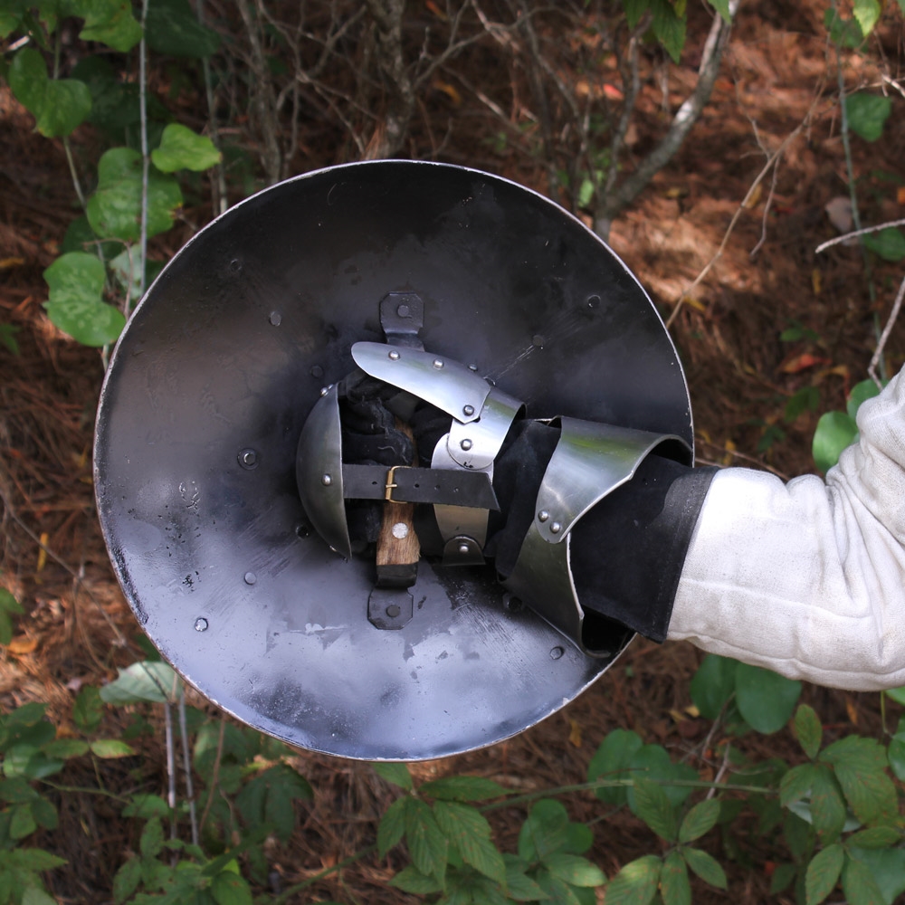 The Medieval Fluted Buckler Shield is modeled after the small shields used in Europe during the Middle Ages and Renaissance periods. It is characterized by a central handle which sits behind the boss and commonly served as a companion weapon, especially in hand to hand combat. Featuring 14 gauge mild steel construction, this piece has a wooden handle riveted in place and a diameter of 15.5 in. It is light weight and convenient to carry. It also promises to be effective for close combat re-enactments and is a great compliment to any costume ensemble.