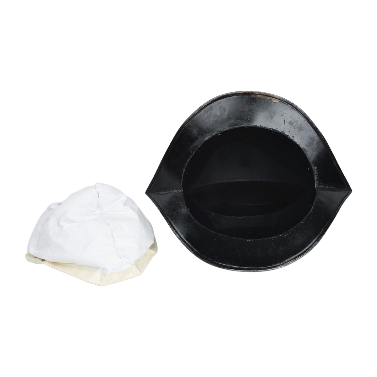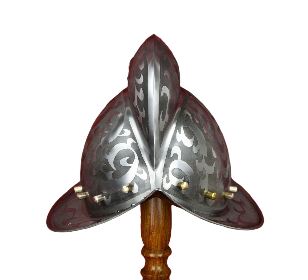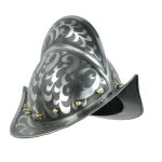 This Morion Helm of 18 gauge steel is thoroughly decorated with etched exterior design and finished with brass pins at the helmet base. The inside is blackened and is unlined. Included with the helmet is padded cotton arming cap.