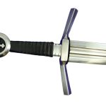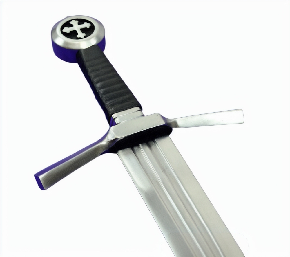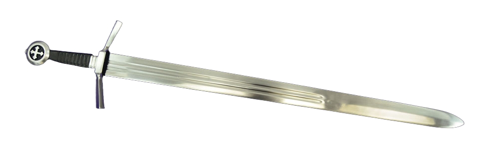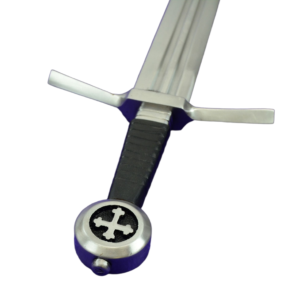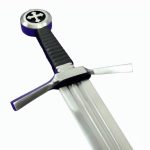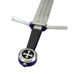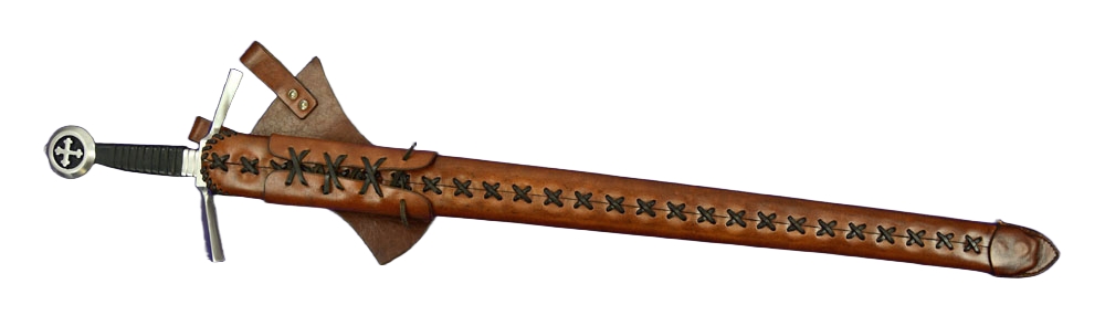 This Medieval Cruciform Pommel Sword has a blade crafted from EN45 high carbon steel. The hilt is steel and the wooden grip is overlaid in leather. A felt tab is atop the guard to give it a cushioned fit against the scabbard – it can be removed if desired. The scabbard and its separate belt frog with belt loops are of robust stitched leather.