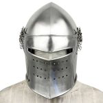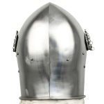 The Medieval Renaissance Detachable Visor Barbute draws inspiration from an Italian designed 15th century visorless war helmet. It is distinguished by a “T” or “Y” shaped opening for the eyes and mouth and its style is still seen in popular culture today. Featuring solid 18 gauge steel construction, this piece reaches down to cover both sides of the face with an arch-shaped opening. It comes with a detachable full face visor that includes 24 breathing holes for ventilation and secured by pins. Further enhancement is added with a leather liner that ensures a comfortable fit. Fully functional and authentically designed, this helmet promises to be an eye catching piece great for costumes, collections, and re-enactments.