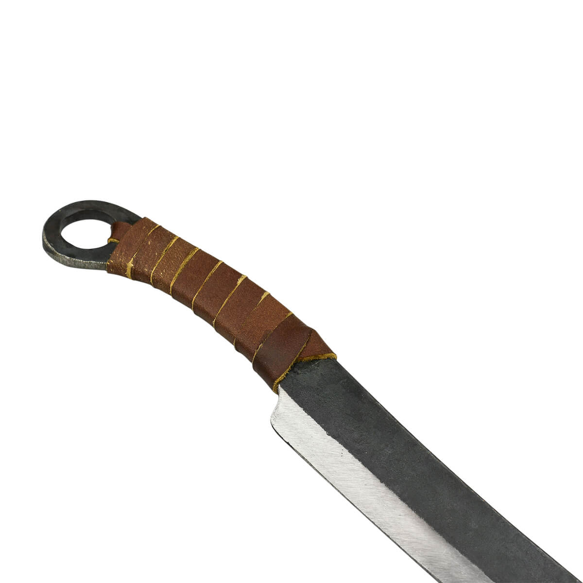 This long-bladed Medieval dagger is rustic and utilitarian in character; an ideal everyday companion for the working Medieval person who could use it for chores, dressing game and self defense alike. Like many historical examples, the blade and grip are a single piece of steel to create a robust and practical tool. The grip is bound in leather and a sheath of stitched leather with integrated belt loops is included.