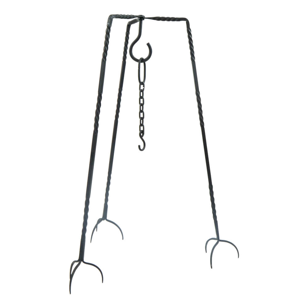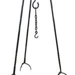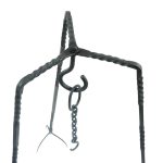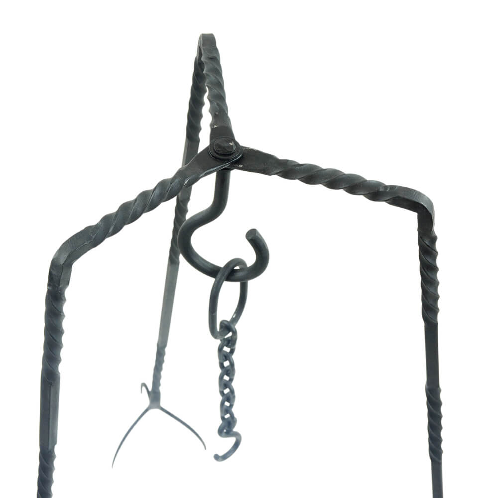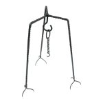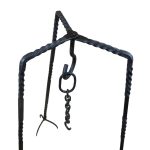 This Medieval Cooking Tripod is crafted from iron. The three legs are connected by a swivel rivet to a central hook – they can be opened and closed as needed. The foot prongs anchor the tripod into the ground. Included is an extension hanging chain with hook.