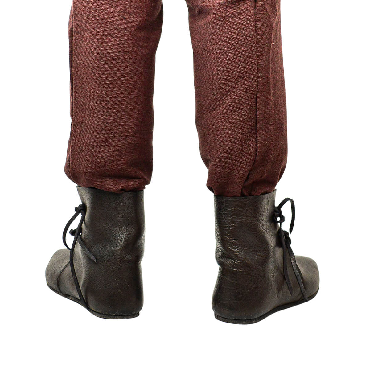 These medieval shoes are made from high quality black leather that is both durably thick and supple. Two sets of leather lacing cords fastens them to the feet and the sole is made from thick and stiff hardened leather which is cobbled onto the shoe with small nails.