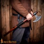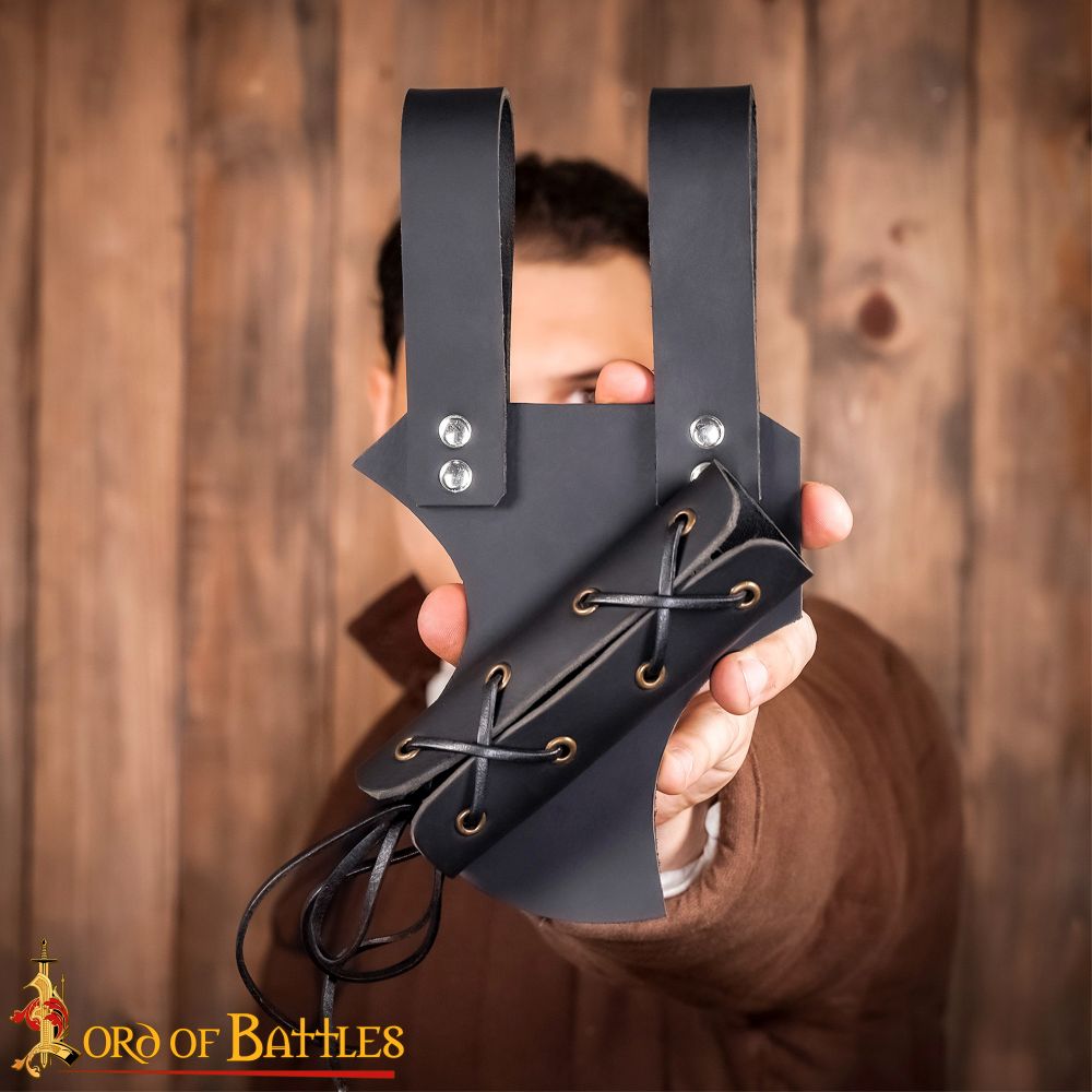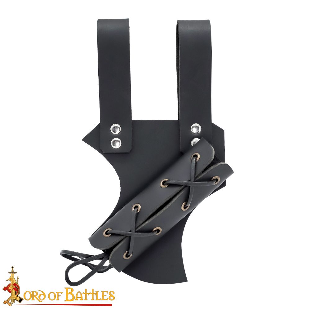 For you are a knight out on another crusade, this stout leather frog will make sure to always carry your most deadly weapon for you. It is meticulously handmade from sturdy TOP GRAIN LEATHER. The holder has adjustable strings for variable weapon widths (for different swords and axes). The loops are attached to the frog with antique brass rivets that can easily fit a belt of width 10cm. Its dimensions are approx. (25 X 14) cm.