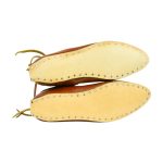 These Medieval boots are handcrafted from stitched leather and cobbled with nails onto a thick sole of stiffened leather. A pair of leather toggles fastens the boots to the feet.