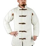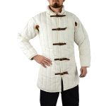 This Gambeson Padded Armor Jacket is made from strong canvas and padded on the inside with poly-fill. The open-armpit design improves ventilation and arm movement. The brass-buckled front makes it easy to get into and out of this gambeson and also gives it some degree of adjustability to fit.